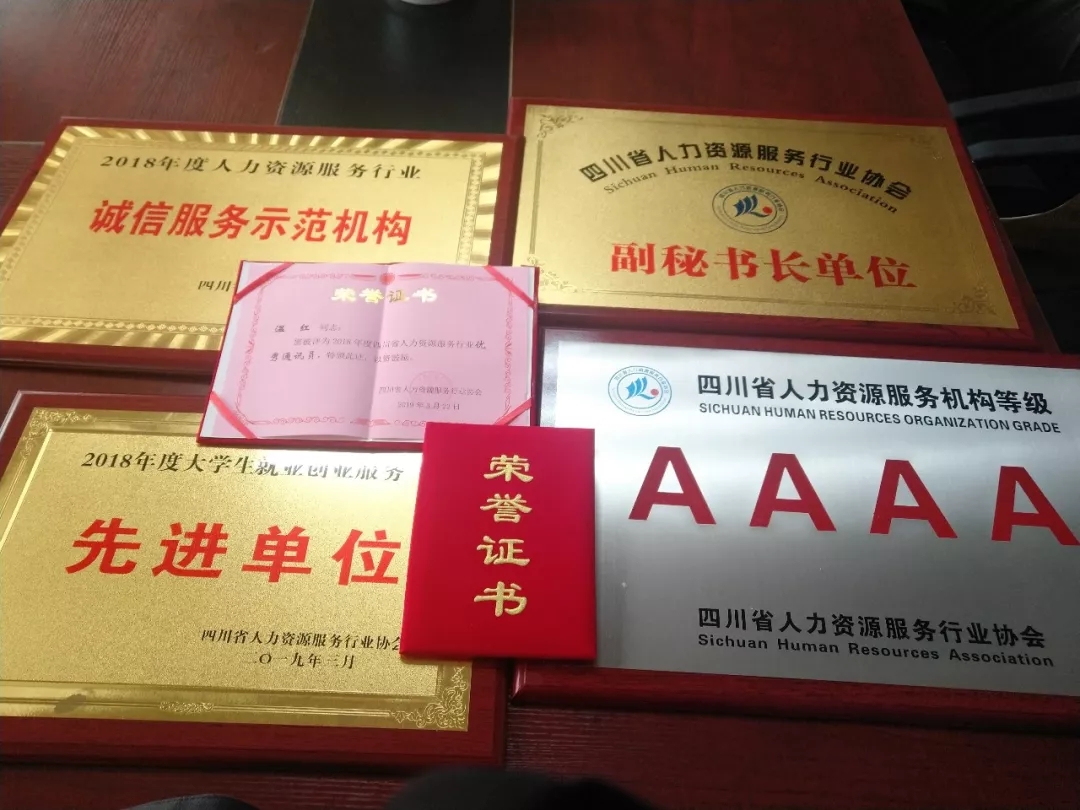 会上,四川省人力资源服务行业协会对16家机构进行了等级评定,同时表彰了2018年度四川省人力资源服务业“诚信服务示范机构”、“诚信服务机构”、2018年度大学生就业创业服务先进单位”,四川英联中才人力资源管理有限公司被评为4A级机构,同时荣获“2018年度四川省人力资源服务业诚信服务示范机构”、“四川省人力资源服务行业协会副秘书长单位”、“2018年度大学生就业创业服务先进单位”的荣誉称号。英联中才能荣获此次殊荣,充分体现了省人力资源服务行业协会及社会各界对我们工作的充分肯定。