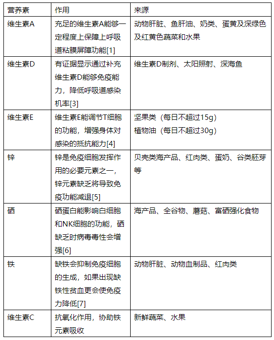 5. 充足的维生素及矿物质 每人每日1斤新鲜蔬菜、半斤新鲜水果能够保证大部分的水溶性维生素及矿物质的充足供应。除此之外,还有一些对免疫系统有特殊作用的维生素及矿物质: