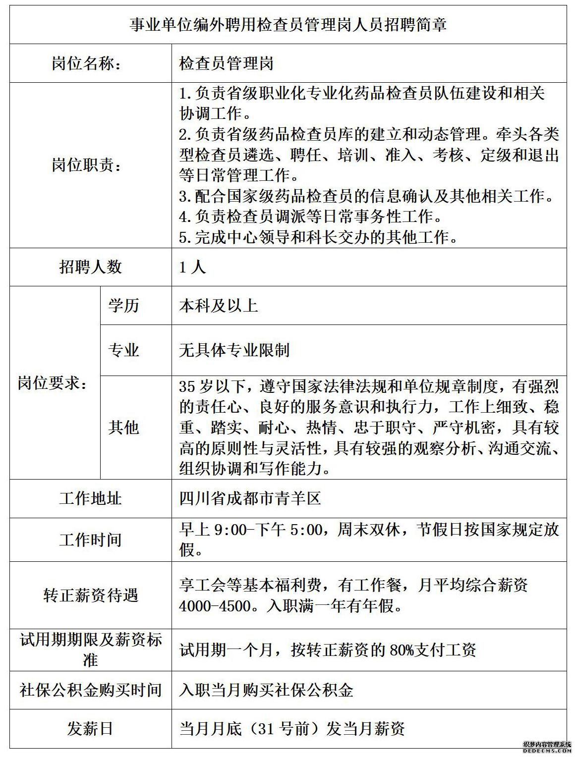事业单位编外聘用检查员管理岗人员招聘简章