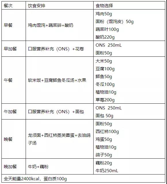 (1) 适当增加能量摄入,可按照35-40kcal/(kg·d),供给充足的碳水化合物,少量多餐,可用易消化吸收的软饭、烂面条、馄饨及松软糕点等。如果日常膳食无法满足能量需要可采用口服营养补充(ONS)特殊医学用途配方食品进行补充;
